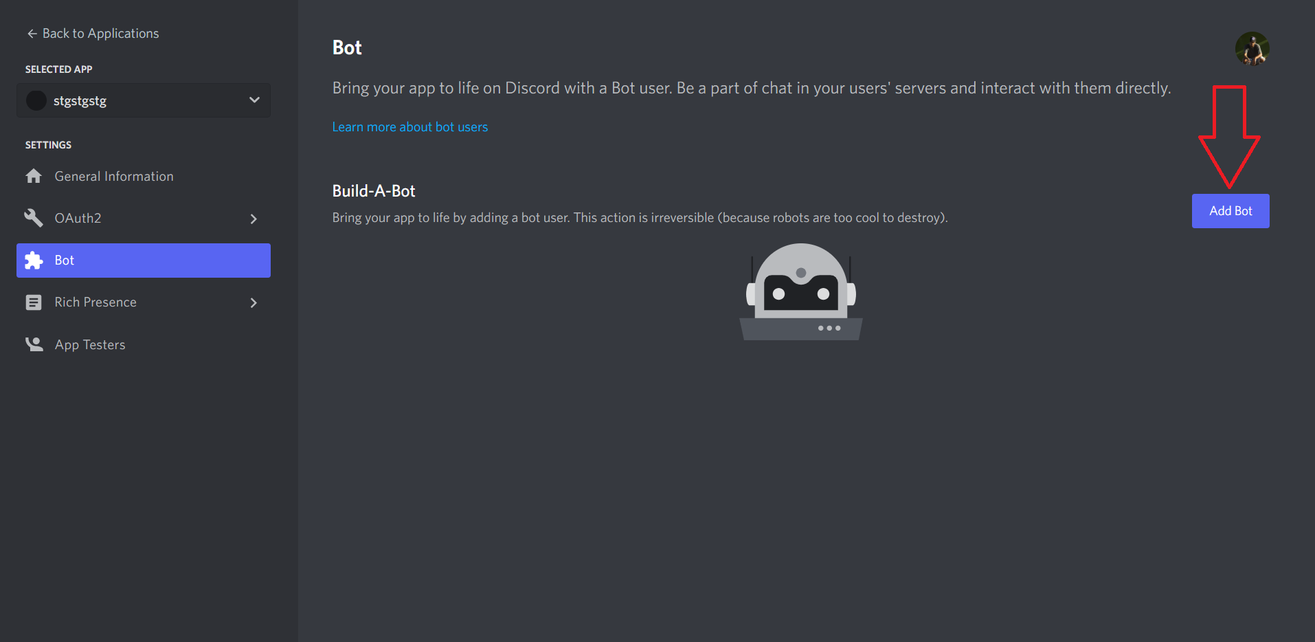 Go to the "Bot" section and click on the "Add Bot" button